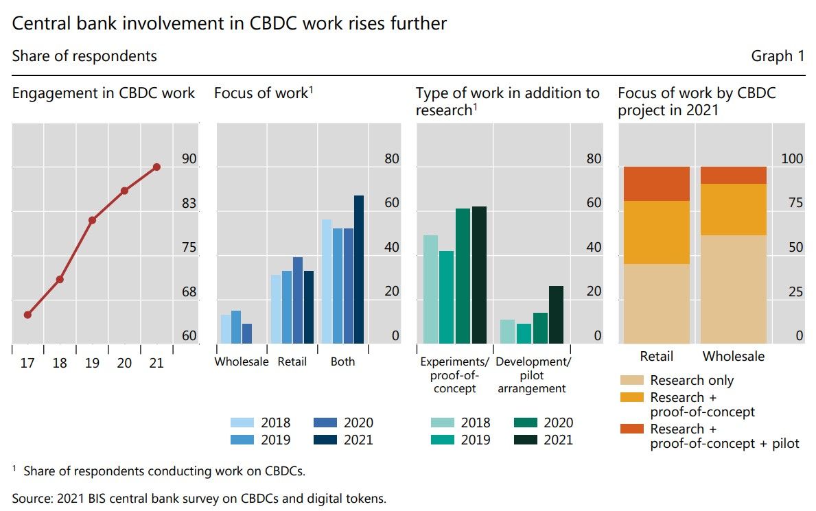 Au niveau mondial, plus des deux tiers des banques centrales considèrent qu’elles sont susceptibles ou pourraient éventuellement émettre une MNBC de détail à court ou moyen terme. Les travaux sur les MNBC sont de plus en plus motivés par des raisons liées à l’efficacité des paiements transfrontaliers.