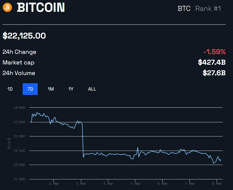 En réponse au discours du banquier américain, la capitalisation boursière du marché crypto est tombée à 1,06 billion de dollars, ce qui représente une baisse de 1,3 %. De même, Bitcoin est en baisse de 1,6 % sur la journée, se négociant à 22 125 $ au moment où nous écrivons ces lignes.