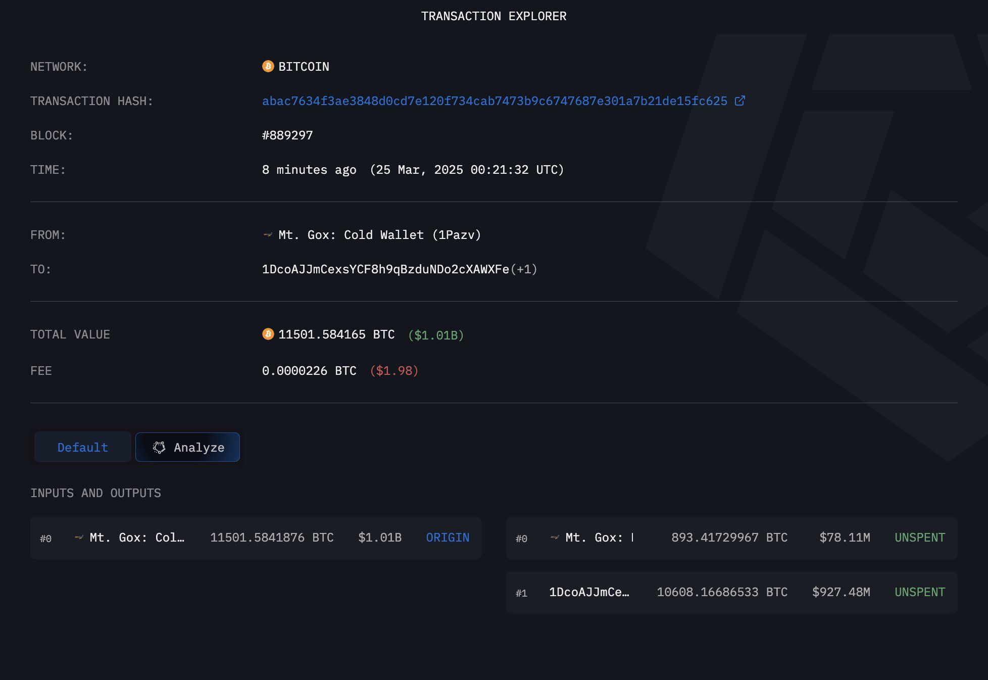 Selon la société d’analyse blockchain Arkham Intelligence, Mt. Gox a transféré un total de 11 501 Bitcoins vers deux portefeuilles. Un portefeuille de changement (adresse : 1DcoA) a reçu 10 608 BTC d’une valeur de 929 millions de dollars. De plus, le portefeuille de stockage à chaud de Mt. Gox (adresse : 1Jbez) a reçu 893 BTC d’une valeur de 78 millions de dollars.