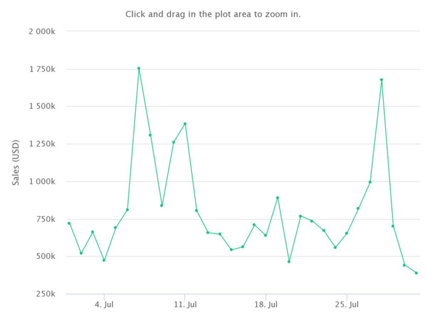 En générant moins de 30 millions de dollars de ventes pour la première fois, le volume a chuté de 236 millions de dollars. Outre les acheteurs uniques et les transactions, le prix moyen de vente a également dégringolé passant de 92 874 $ en avril à 22 326 $ en juillet, soit une baisse de 75%.