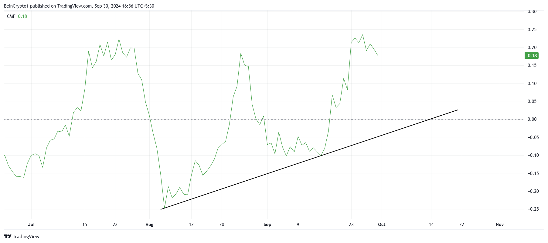 Le Momentum macro reste également fort. En effet, puisqu’il est soutenu par des indicateurs techniques clés. L’un de ces indicateurs est le Flux de Capitaux Chaikin (CMF), qui mesure les flux entrants et sortants de capital dans l’actif. Depuis le début août, le CMF est sur une tendance ascendante, suggérant une pression d’achat croissante.