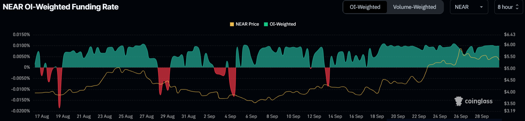 La récente baisse du cours n’a pas contrecarré le sentiment positif qui règne autour de Near Protocol. Le taux de financement reste positif, indiquant que les traders sont toujours optimistes quant au mouvement futur du cours de l’actif. Un optimisme continu de la sorte suggère en effet que les investisseurs prévoient une nouvelle hausse du cours du NEAR.