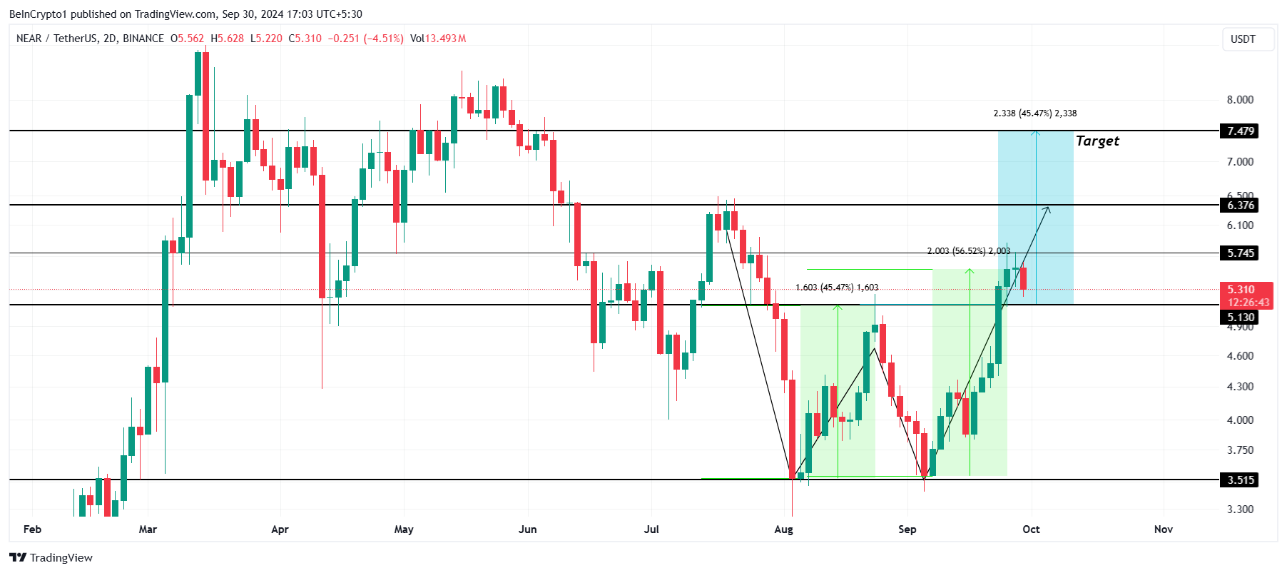 NEAR se négocie actuellement à 5,31 $ après une tentative infructueuse de franchir la résistance cruciale à 5,74 $. Ce niveau a servi à la fois de barrière et de support dans le passé. En conséquence, ce niveau est d’une importance capitale pour le NEAR. D’ailleurs, franchir avec succès cette résistance pourrait préparer le terrain pour un bien plus grand rallye.