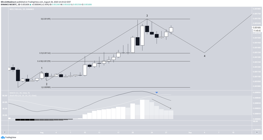 Depuis le 27 juillet, le cours a probablement démarré une formation ascendante impulsive. Dans ce cas, il se trouve actuellement dans la quatrième vague, qui terminera probablement entre 0,00125₿ et 0,00135₿, soit les niveaux Fibonacci 0,5 et 0,618.
