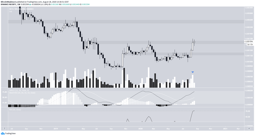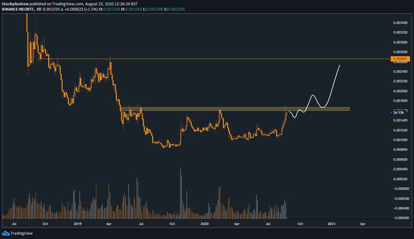 Le trader de cryptomonnaies @ACXtrades affirme que lorsque NEO aura dépassé l’actuelle zone de résistance, il pourrait s’accroître de 55% de plus que son prix actuel, jusqu’à atteindre 0,0026₿. Cette vue d’ensemble comme la zone de résistance indiquée s’accordent avec l’analyse donnée ci-dessus.
