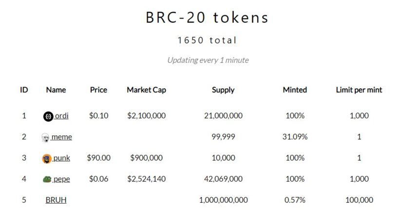 Parmi les tokens BRC-20 actuellement disponibles sur le marché, on peut citer Ordi, Punk et Pepe. Ils ont des capitalisations boursières respectives de 2,1 millions de dollars, 900 000 dollars et 2,5 millions de dollars.