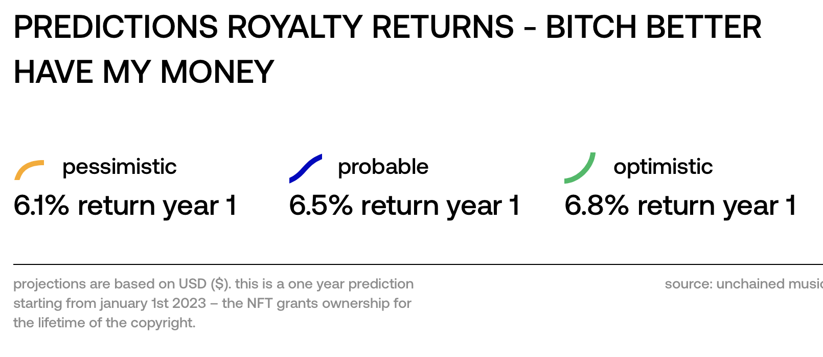 En se basant sur les parts octroyées aux acheteurs de la collection, il faudrait des redevances de streaming de 6 363 636 $ pour que chaque NFT soit remboursé. Ensuite, ces derniers pourraient éventuellement devenir rentables. Pour atteindre ce montant, il faut prendre le prix de chaque token non fongible ; 210 $, et le diviser 0,0033 %.