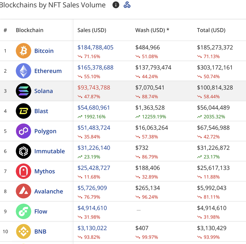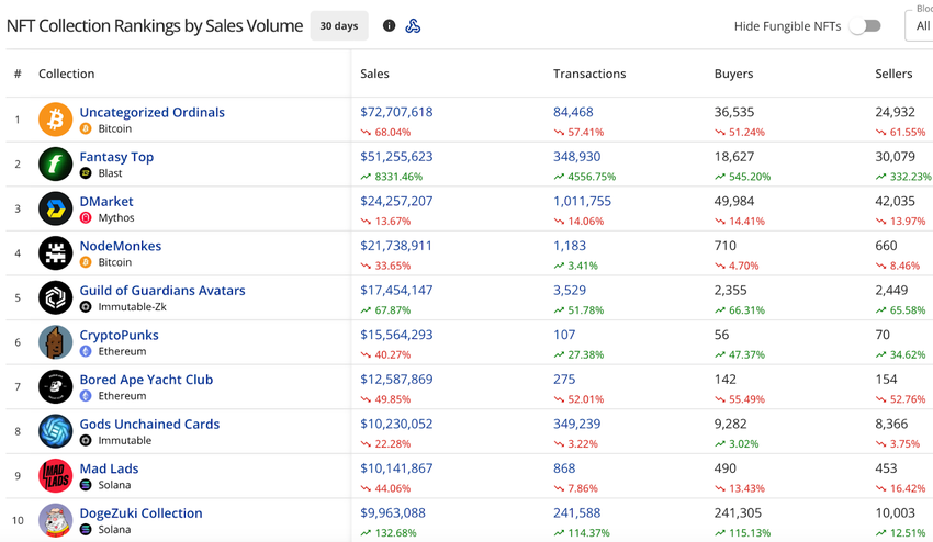 SponsoredParmi le top 10, Avalanche a subi la plus forte perte de volume d’échanges avec -81,11 %. Les réseaux Blast et Immutable sont les seuls à maintenir la tête hors de l’eau avec une hausse respective des ventes de NFT de 2035,32 % et 23,57 %. Il est important de noter que, malgré la forte baisse des échanges, les NFT développés sur Bitcoin restent les plus vendus avec un volume de 184 millions de dollars. Les ordinals sont les projets NFT les plus vendus avec près de 72 millions de dollars de ventes, devant les projets Fantasy Top (51,25 millions de dollars) de Blast et DMarket (24,25 millions de dollars).