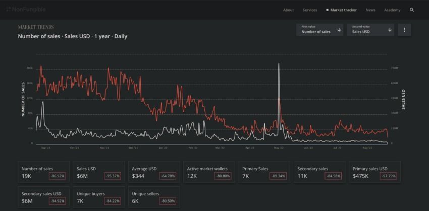 SponsoredSelon NonFungible, le volume de ventes quotidiennes a culminé à près de 210 000 le 27 août 2021, et deux jours plus tard, il a dépassé 430 millions de dollars.