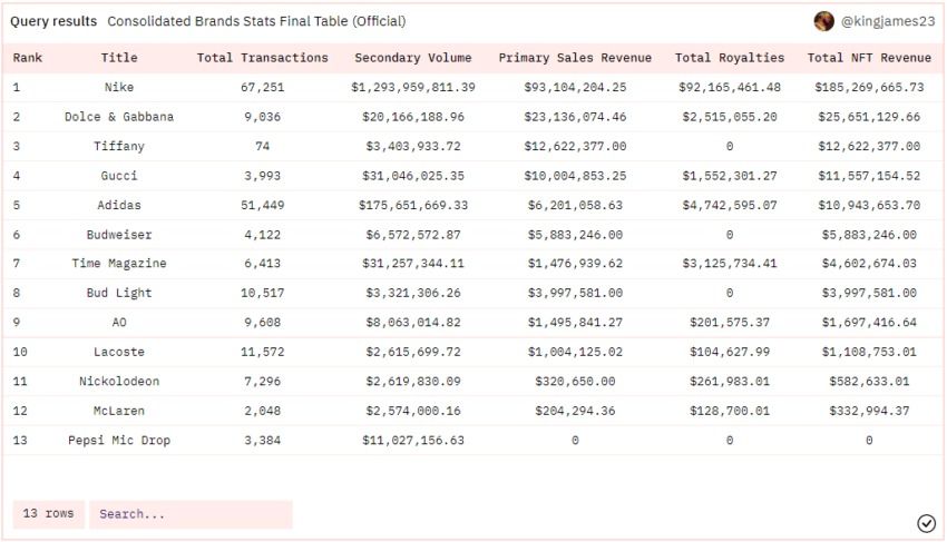 Selon les données de Dune Analytics, Nike a réalisé 185 millions de dollars de ventes NFT, surpassant toutes les autres marques.