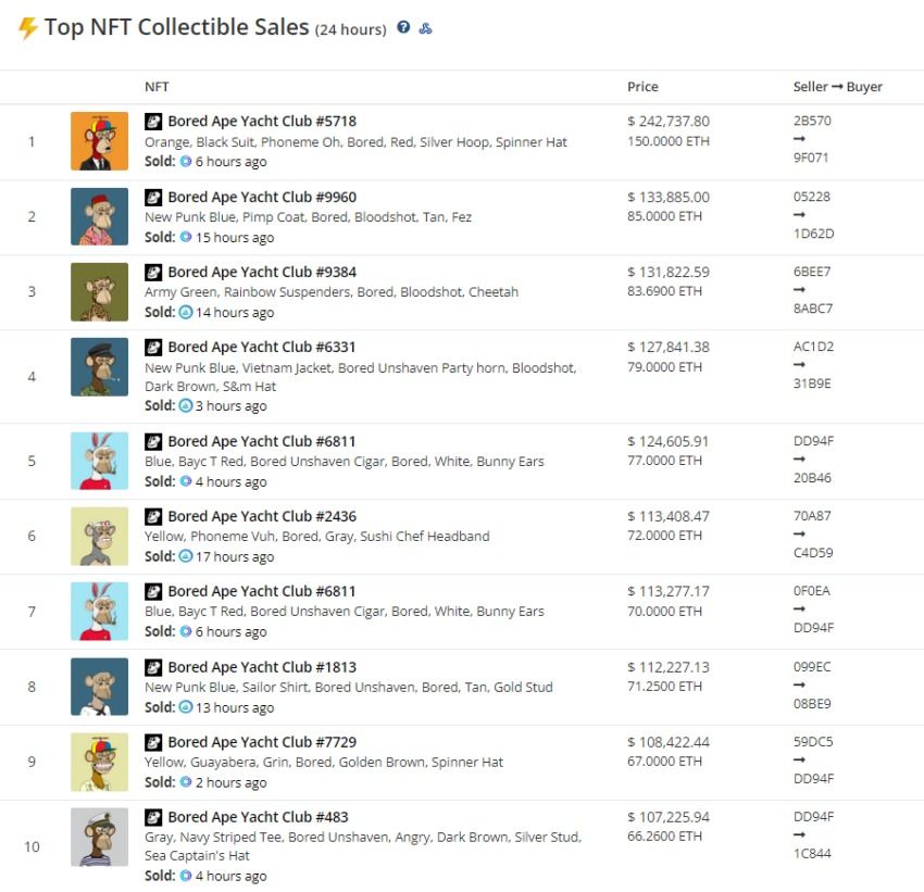 Malgré le ralentissement du marché des jetons non fongibles, certaines collections continuent de dominer les ventes. Selon CryptoSlam, les 10 meilleures ventes NFT des 24 dernières heures se composaient uniquement de NFT Bored Ape Yacht Club.