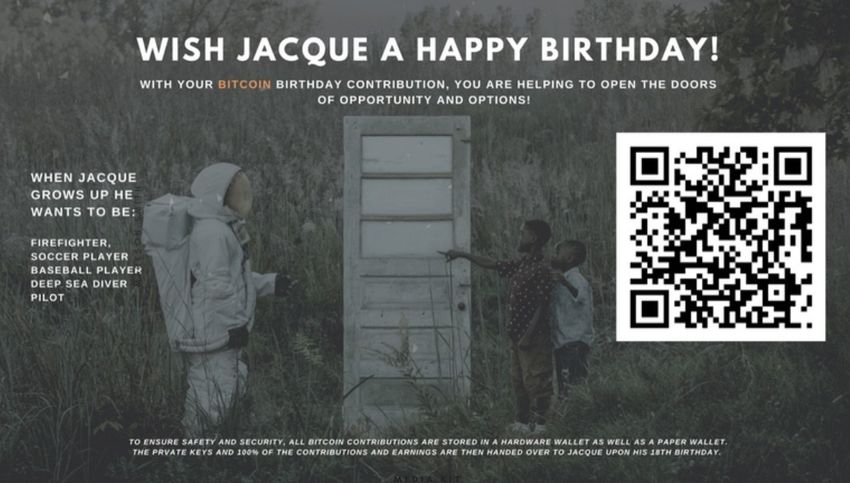 Chaque année, à l’anniversaire de chacun de ces deux enfants (respectivement le 6 novembre et le 10 août), un code QR apparaîtra sur l’ensemble de l’œuvre, permettant aux utilisateurs de le scanner et de faire un don à un portefeuille Bitcoin lié.