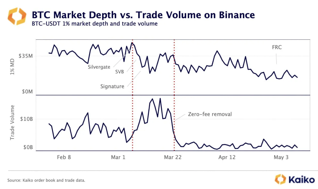 Binance ne serait plus le leader incontesté du marché des cryptomonnaies. Selon les récentes données partagées par la firme Kaiko, l’échange aurait vu sa part de marché passer de 73 % à 51 % pendant l’application de sa nouvelle politique sur les frais de trading entre mars et mai. Pendant cette période, les liquidités de BTC sur la plateforme ont pratiquement diminué de moitié.