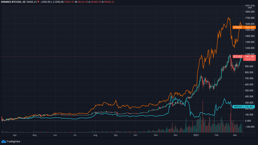 Un bref aperçu des trois cryptomonnaies montre que si le BTC a augmenté d’environ 1 000% depuis le début de l’année, l’ETH a finalement fait encore mieux, avec plus de 1 500%. Quant au XRP, il n’affiche “que” 232% de hausse pour l’année écoulée.