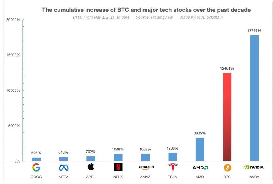 Ainsi, c’est Nvidia qui s’empare de la première place du classement, avec une performance inégalée même par Bitcoin. La société IA a bien profité des dernières vagues liées à l’intelligence artificielle en bondissant depuis maintenant plus d’un an. Première conséquence : l’actif a dépassé Bitcoin sur la décennie avec une hausse de 17 797 %. Pour sa part, le BTC, qui s’est déjà bien remis de son bear market, est deuxième avec un gain de 12 464 %.