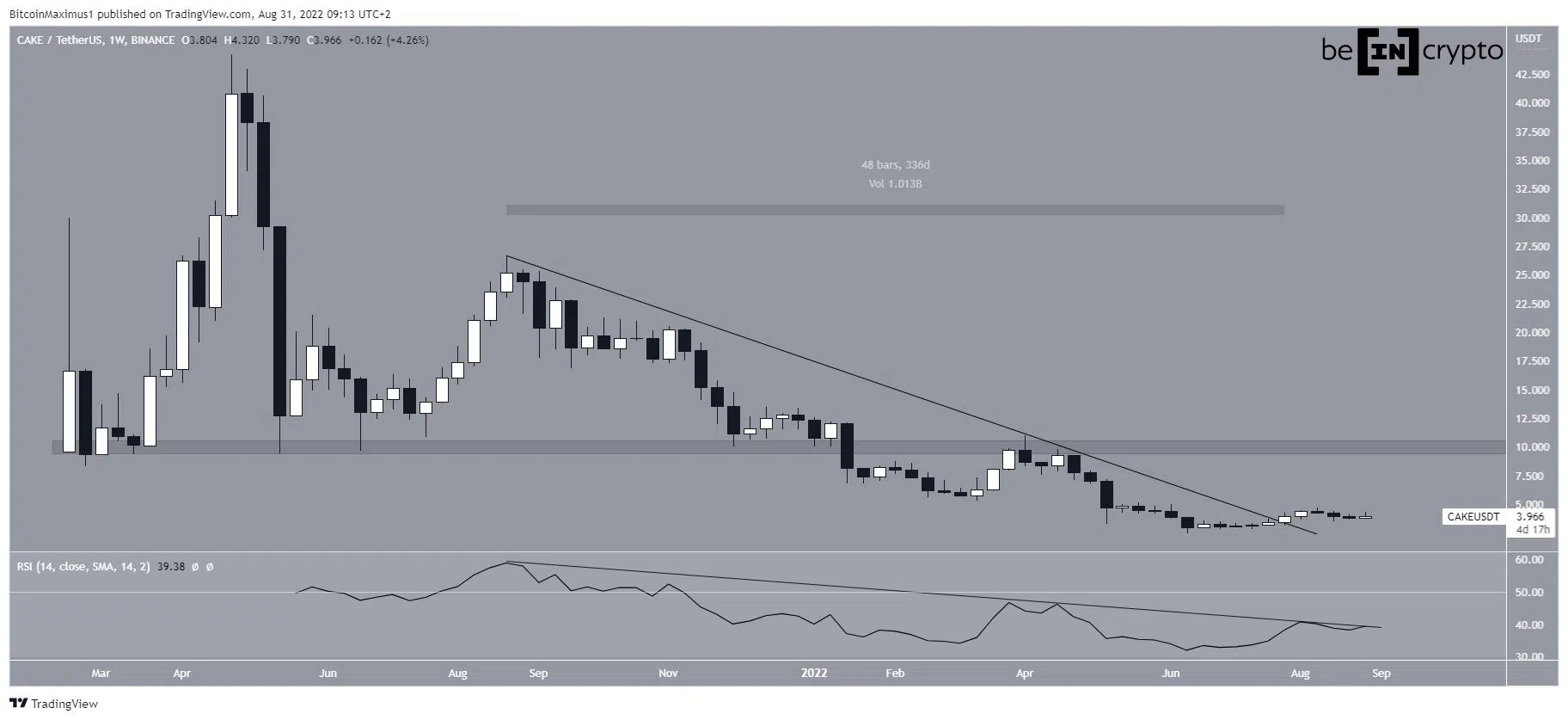 Le token CAKE déclinait sous une ligne de résistance descendante depuis août 2021. Ce mouvement de baisse l’a mené à un creux de 2,48 $ atteint en juin 2022.