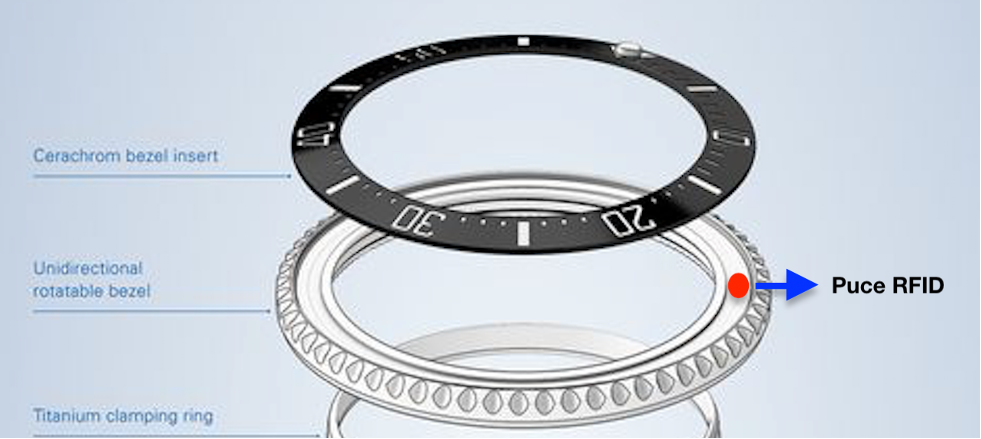 Alors, pourquoi ne pas faire du NFT et de la montre une même entité ? En insérant une puce RFID sous l’insert de la lunette, la montre elle-même deviendrait le NFT ! Il deviendrait impossible, ainsi, de vendre une montre sans son NFT, ou, inversement, de vendre le NFT avec une montre ne lui correspondant pas.