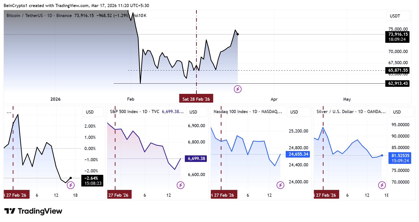 Alors que les marchés traditionnels plient sous le poids de ces inquiétudes, Bitcoin affiche une résilience notable. Depuis le regain de tension entre les États-Unis et l’Iran fin février, le cours du BTC a gagné près de 7 %, surpassant l’or, le S&P 500 et le Nasdaq 100. Coté autour de 73 916 $, il s’approche d’un plus haut de six semaines après un rebond de 25 % depuis son bottom de février.