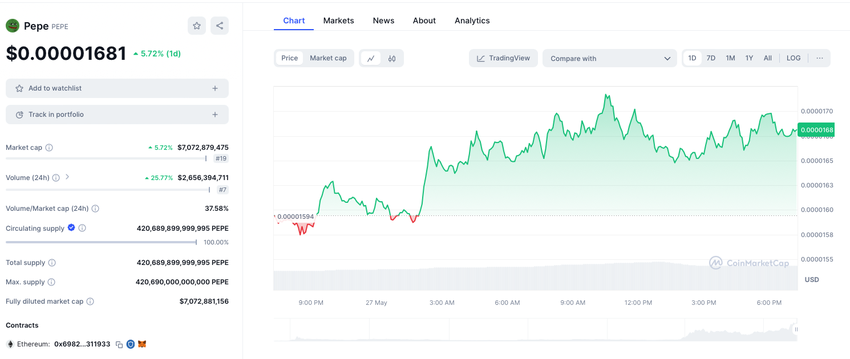 Pepe (#PEPE) memecoin reached a record high on May 27, driven by the approval of key #Ether ETF filings in the U.S., which boosted Ethereum-based #memecoins.