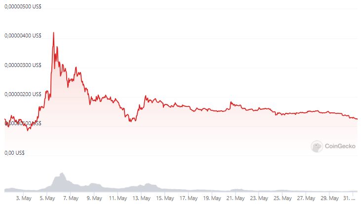 Et pourtant, le token se trouve dans une spirale baissière. Ce, depuis qu’il a atteint son sommet historique de 0,00000431 $ le 5 mai.
