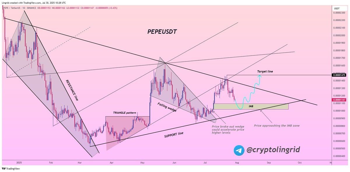 Malgré ce contexte tendu, plusieurs analystes restent optimistes sur une reprise rapide. Lingrid identifie une structure en biseau descendant similaire à celle observée en juin, juste avant un rallye majeur. Le prix est en train de tester la zone IMB (important market base), qui avait déjà agi comme tremplin dans le passé.