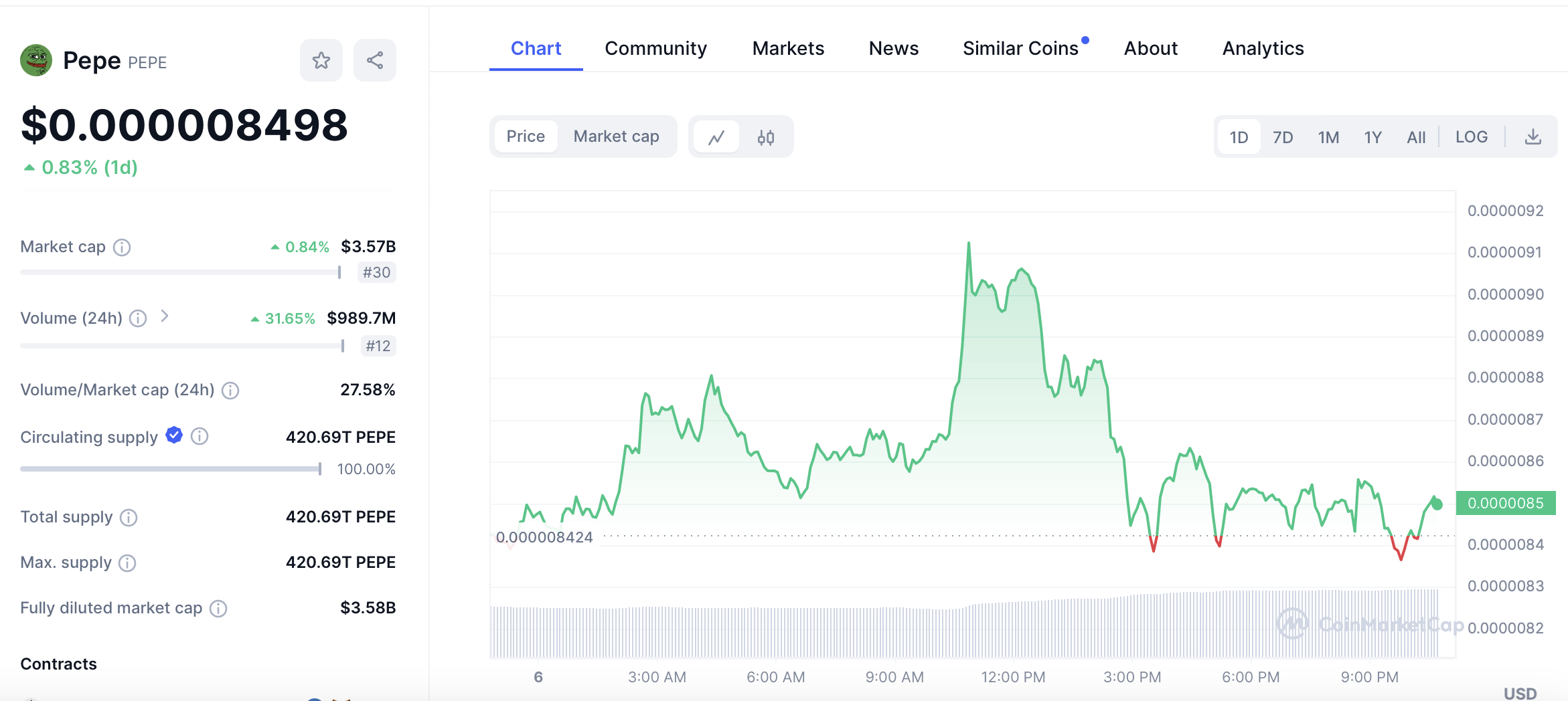 Avant d’envisager de surpasser Shiba Inu ou Dogecoin, la Pepe army doit considérer l’avenir immédiat du token. Suite à une correction significative en avril, Pepe montre des signes de reprise : en trois jours, le mèmecoin a gagné 19,75% et se négocie actuellement à 0,000008498$, soit -20,97% en dessous de son plus haut historique (ATH).