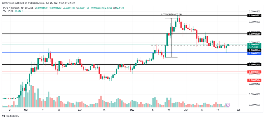 PEPE tente actuellement de rebondir sur le support à 0,00001146 $. Une issue favorable qui se confirmerait permettrait une hausse jusqu’à 0,00001369 $, le prochain niveau de résistance critique pour le meme coin.