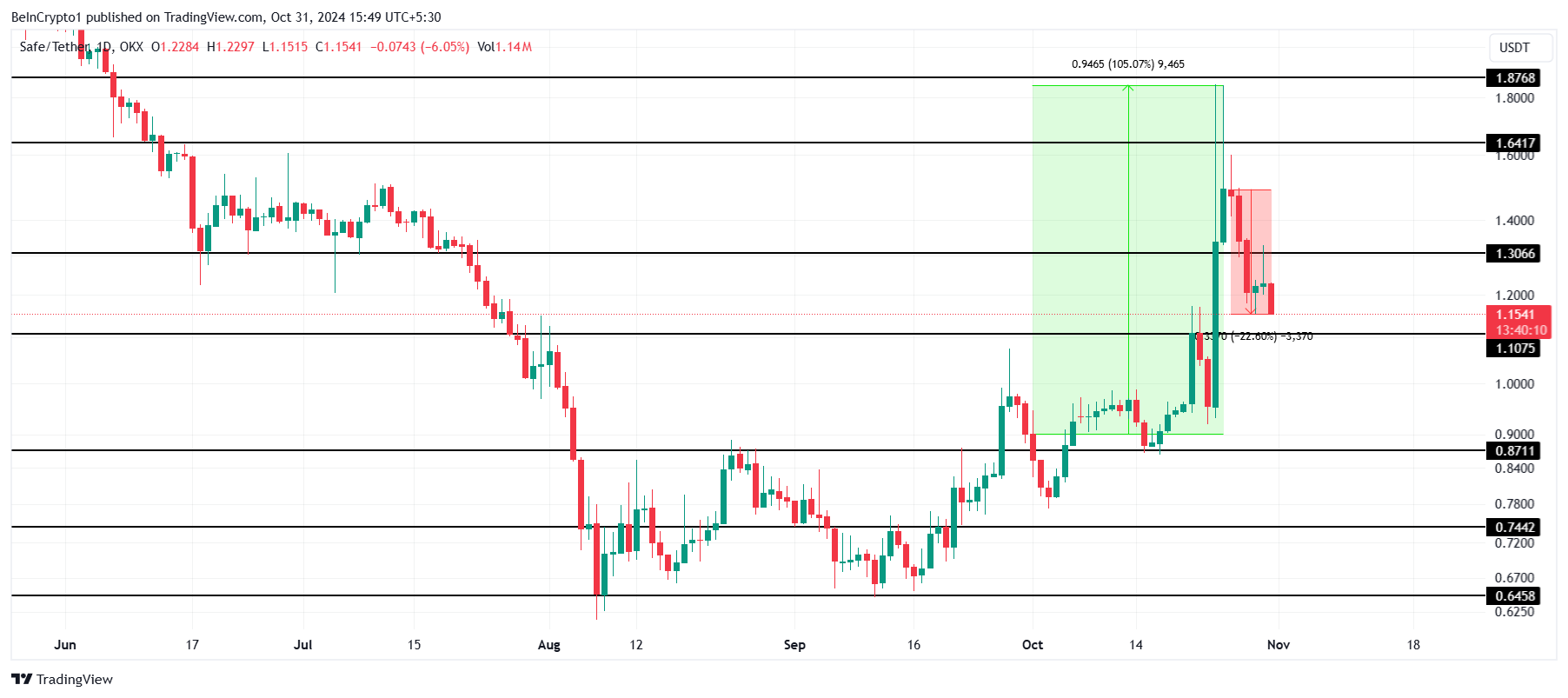 L’altcoin SAFE a récemment atteint un sommet sur plusieurs mois à 1,80 $, marquant une hausse de 105 %. Cependant, son cours a diminué de 22 % au cours de la semaine dernière, reflétant là une pression accrue de vente à court terme. Cette correction souligne bien la volatilité actuelle alors que les traders réalisent leurs profits, impactant la stabilité à court terme de cet altcoin également.