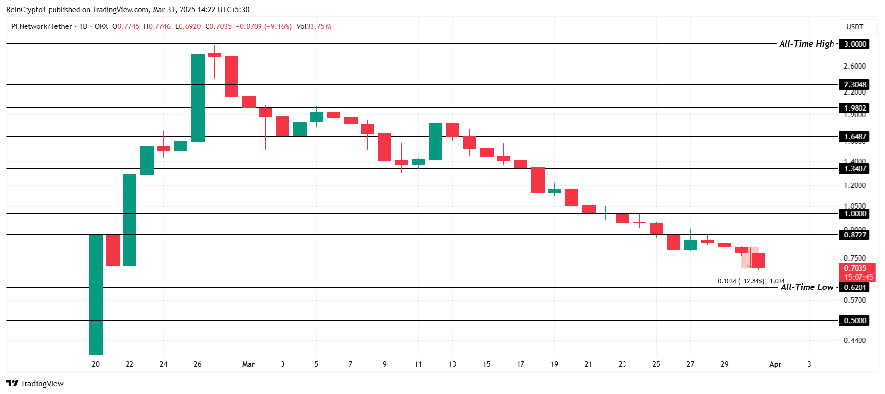 Le Pi est actuellement échangé à 0,70 $, juste au-dessus de son Plus bas historique situé à 0,62 $. L’altcoin a connu une baisse de 12,8 % au cours des dernières 24 heures après avoir échoué à reconquérir les 0,87 $ en tant que support. Cet échec à regagner les niveaux de support précédents montre un manque continu de confiance de la part des investisseurs.
