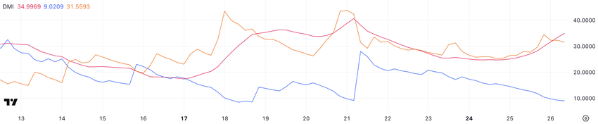 Le graphique DMI de Pi Network montre que son ADX a grimpé à 34,99 contre une valeur de 25,1 il y a seulement un jour. Ainsi, la tendance actuelle (baissière) s’est renforcée. LADX, ou Average Directional Index, mesure l’intensité d’une tendance sans en indiquer sa direction.