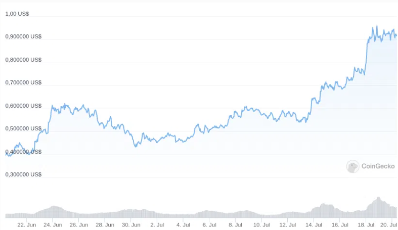 Si la tendance haussière se poursuit, le cours pourrait dépasser prochainement la barre du dollar, revenant ainsi à une région de prix qu’il n’a pas connue depuis mai dernier.