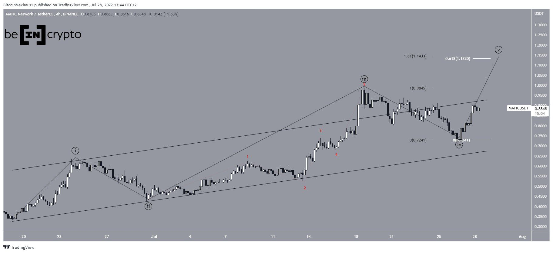 Sur le court terme, il semblerait que Polygon ait amorcé un mouvement de hausse en cinq vagues le 18 juin et vienne juste de compléter un repli de quatrième vague. L’objectif le plus plausible pour le sommet de la cinquième vague se trouve entre 1,13 $ et 1,14 $. On trouve cet objectif en utilisant un retracement externe de 1,61 sur la vague, ainsi que la longueur 0,618 des vagues un et trois (en blanc).