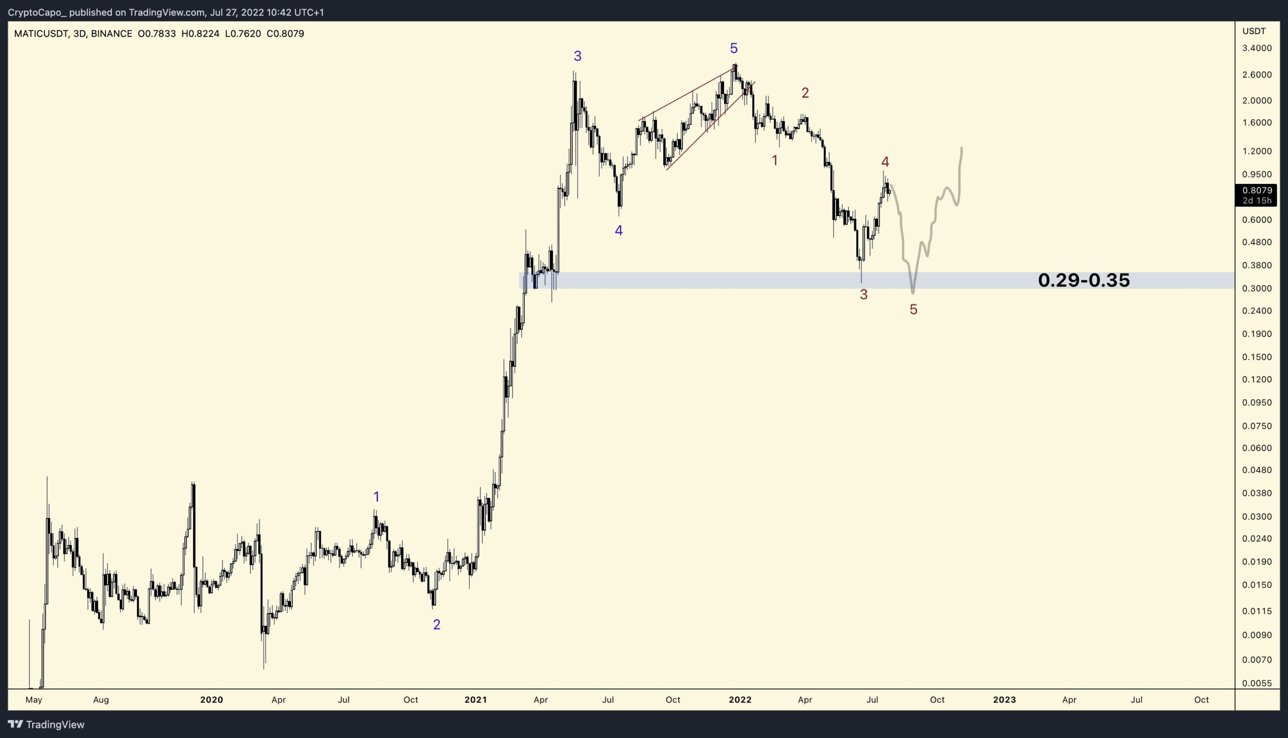 Le crypto trader @CryptoCapo a partagé sur Twitter un graphique du MATIC, affirmant que le cours est en train de compléter la vague quatre d’un mouvement de déclin en cinq vagues.