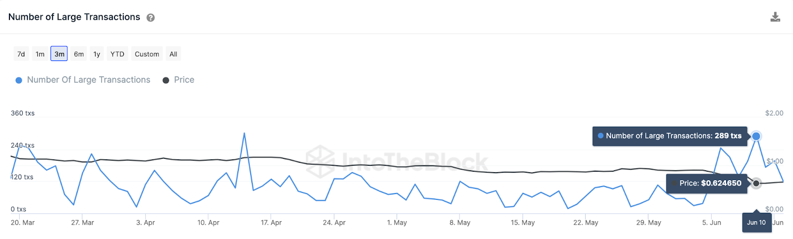 Le graphique ci-dessous montre comment les grandes transactions impliquant MATIC ont bondi de 680 %. Elles sont passées de 37 transactions le 4 juin à un pic sur deux mois de 289 transactions le 10 juin. Enfin, le 13 juin, plus de cents transactions ont également été effectuées.