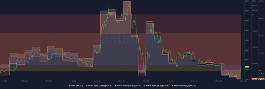 L’indicateur Age Consumed (âge consommé) de Santiment suggère que plus de tokens MATIC “inactifs” ont été déplacés au cours du dernier mois que pendant les trois dernières années combinées. L’âge consommé a en effet montré d’importants pics à partir du 16 novembre.