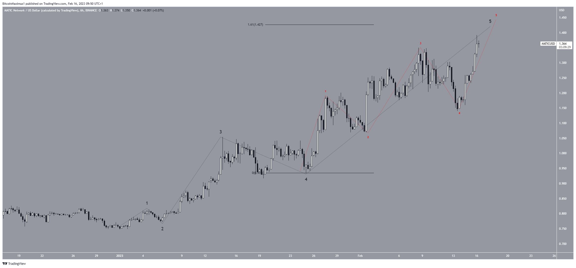 Le décompte de vagues du cours soutient cette possibilité, indiquant que l’actif se trouve dans une vague cinq étendue (en noir). Le décompte de sous-vagues est indiqué en rouge. L’objectif le plus plausible pour le sommet du mouvement se trouve à 1,43 $. Il correspond à la longueur 1,61 des vagues un et trois combinées.