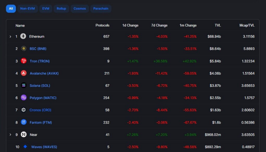 Après avoir coulé de plus de 2 milliards de dollars en TVL, Polygon mène toujours Cronos, Fantom, Near, Waves, Bitcoin, EOS, Cardano, Algorand et Terra.