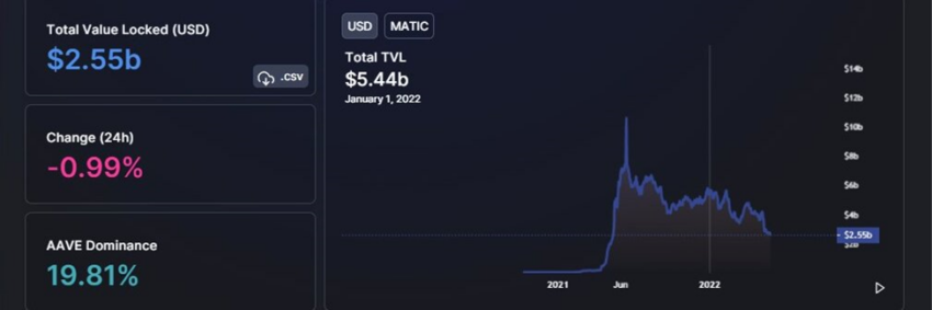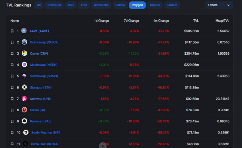 Protocole de liquidité open source, Aave a chuté de plus de 41% au cours du dernier mois. La plateforme d’échange de Stablecoin Curve a perdu plus de 30% de sa TVL dans le même laps de temps. Les échanges décentralisés Quickswap et SushiSwap ont perdu plus de 41% et 44% de leurs valeurs totales respectives verrouillées.