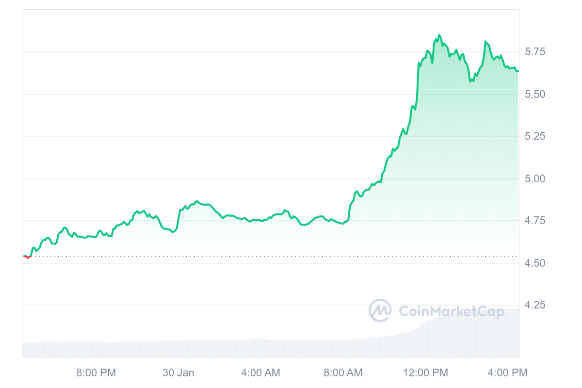 Le nouvel ATH a été fixé à 5,85 $ ce jeudi, mais l’effort ne se limite pas à une seule journée seulement. Si l’actif est en découverte de prix, c’est en raison d’une hausse hebdomadaire de 53,43 %. Ce jeudi en particulier, OM a rayonné en augmentant de près de 25 % sa valeur.