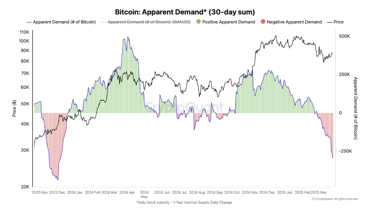« La croissance de la demande au comptant de Bitcoin reste en territoire de contraction, avec une baisse de 297 000 Bitcoin au cours des 30 derniers jours, soit la plus grande contraction pour une telle période depuis décembre 2023. Le marché est plus concentré sur les développements macroéconomiques, compte tenu des attentes d’un ralentissement économique et de l’incertitude concernant les tarifs et la politique commerciale de l’administration Trump », a ajouté Moreno.