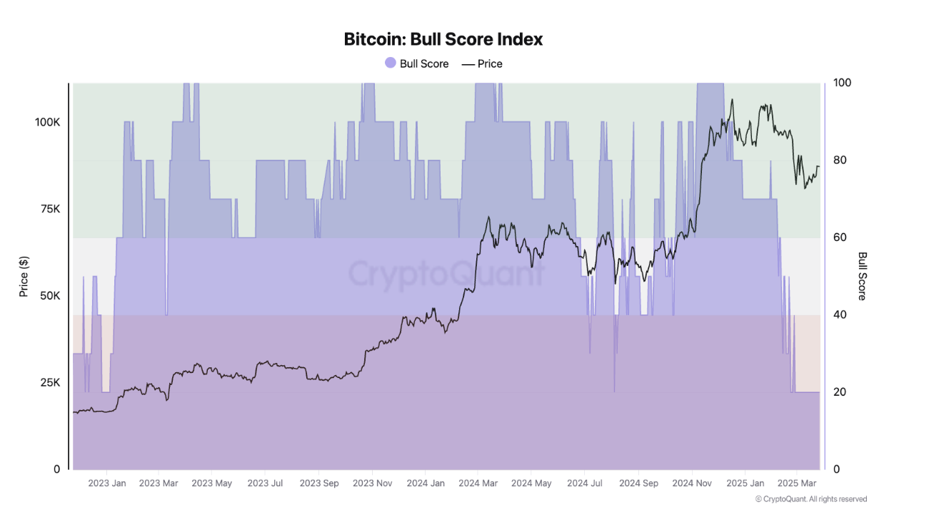 Sponsored« Le sentiment général du marché reste le moins haussier depuis janvier 2023, indiqué par l’indice Bitcoin Bull Score de CryptoQuant. L’indice va de 0 (le moins haussier) à 100 (le plus haussier), et il est à 20 depuis fin février », a expliqué Julio Moreno, responsable de la recherche chez CryptoQuant, à BeInCrypto.