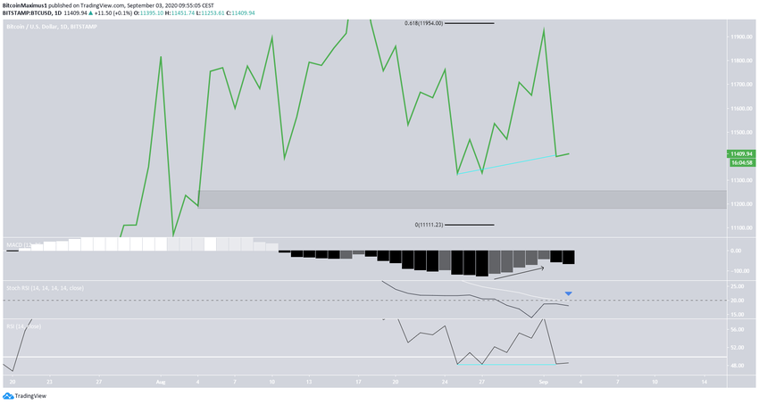 Le cours de Bitcoin est en hausse depuis le 27 août, lorsqu’il a créé un double creux près du support des 11 200$. Le 1er septembre, il a atteint un sommet à 12 065$, légèrement au-dessus du niveau fibonacci 0,618 de l’entier déclin.