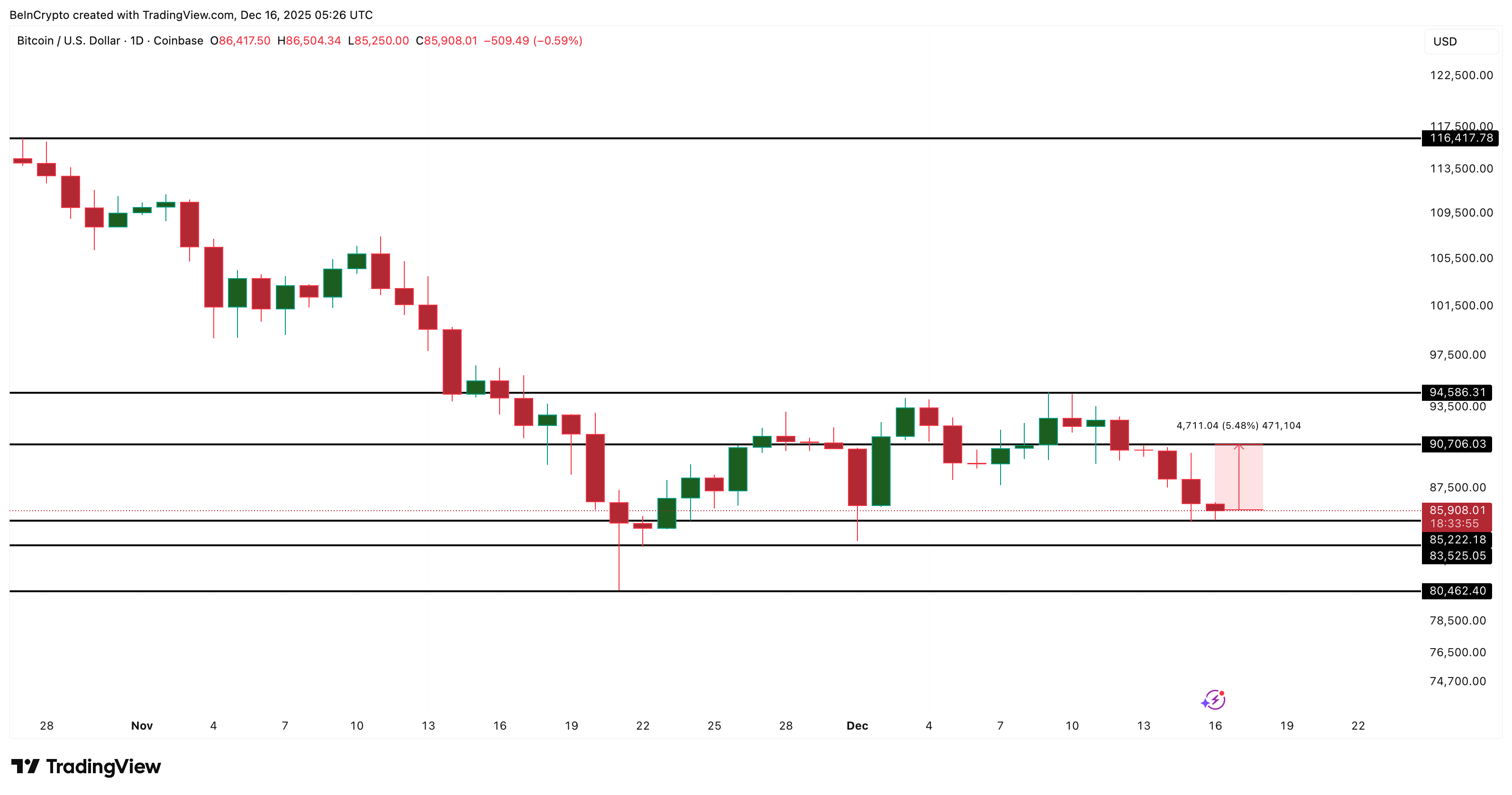 Le cours de Bitcoin a perdu un peu plus de 4 % sur la journée, mais il défend toujours un support important à 85 200 $. Cette zone a absorbé à plusieurs reprises la pression vendeuse et se maintient comme la ligne qui séparé un repli contrôlé d’une correction plus profonde.
