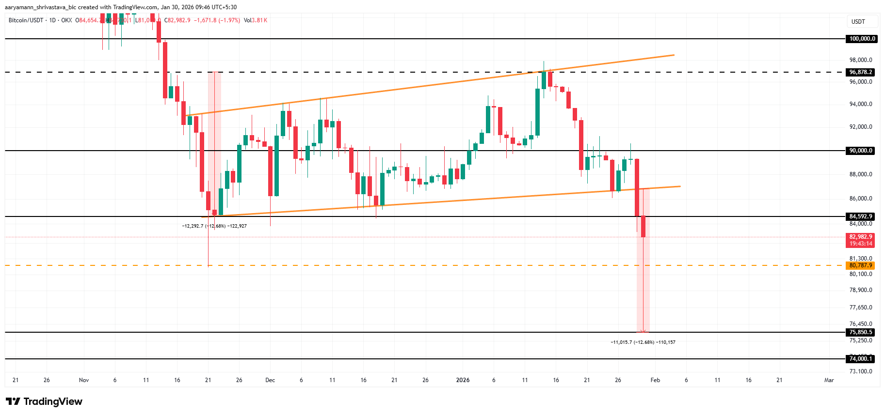 Le cours de Bitcoin s’est encore affaibli, évoluant autour de 82 982 $ au moment de la rédaction. Le roi des cryptomonnaies a chuté sous un un biseau ascendant élargi, une configuration qui projetait un recul de 12,6 %. Ce mouvement a ainsi confirmé l’élan baissier et accru le risque de baisse vers l’objectif technique des 75 850 $.