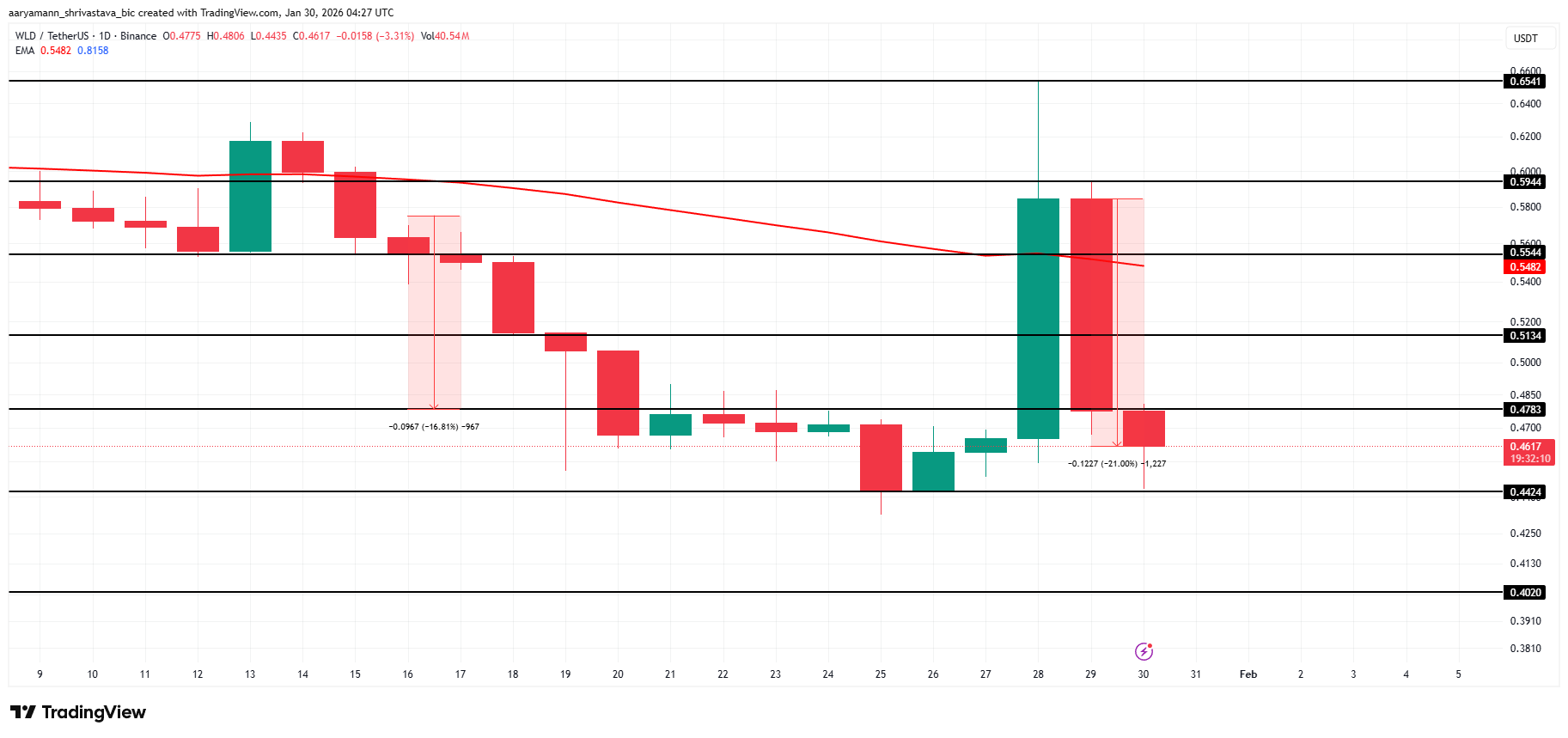 Un scénario de reprise reste possible si l’intérêt acheteur revient. Si le WLD rebondit et franchit la résistance à 0,478 $, l’élan pourrait s’inverser. Le prochain objectif clé serait la moyenne mobile exponentielle à 50 jours, située autour de 0,554 $. Une reconquête de ce niveau annulerait la perspective baissière et pointerait vers une récupération des pertes.