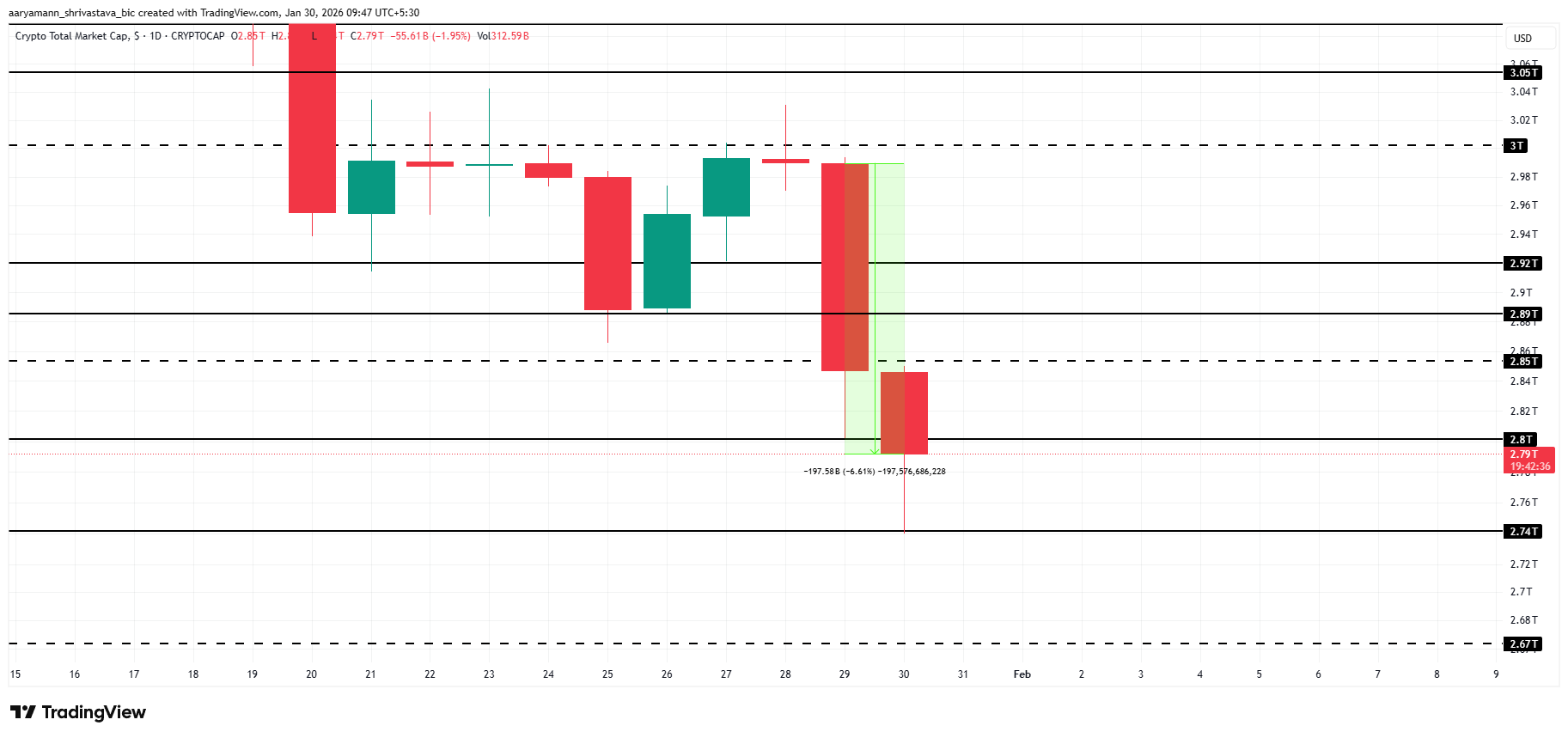 La capitalisation totale du marché des cryptomonnaies a chuté de 6 % au cours des dernières 24 heures, entraînant des pertes d’environ 197 milliards de dollars. La capitalisation (TOTAL) s’établit désormais autour de 2,79 billions de dollars. Cette baisse reflète une aversion généralisée au risque plutôt qu’une faiblesse propre aux cryptomonnaies, les investisseurs ayant réagi à de fortes pertes sur les marchés financiers mondiaux.