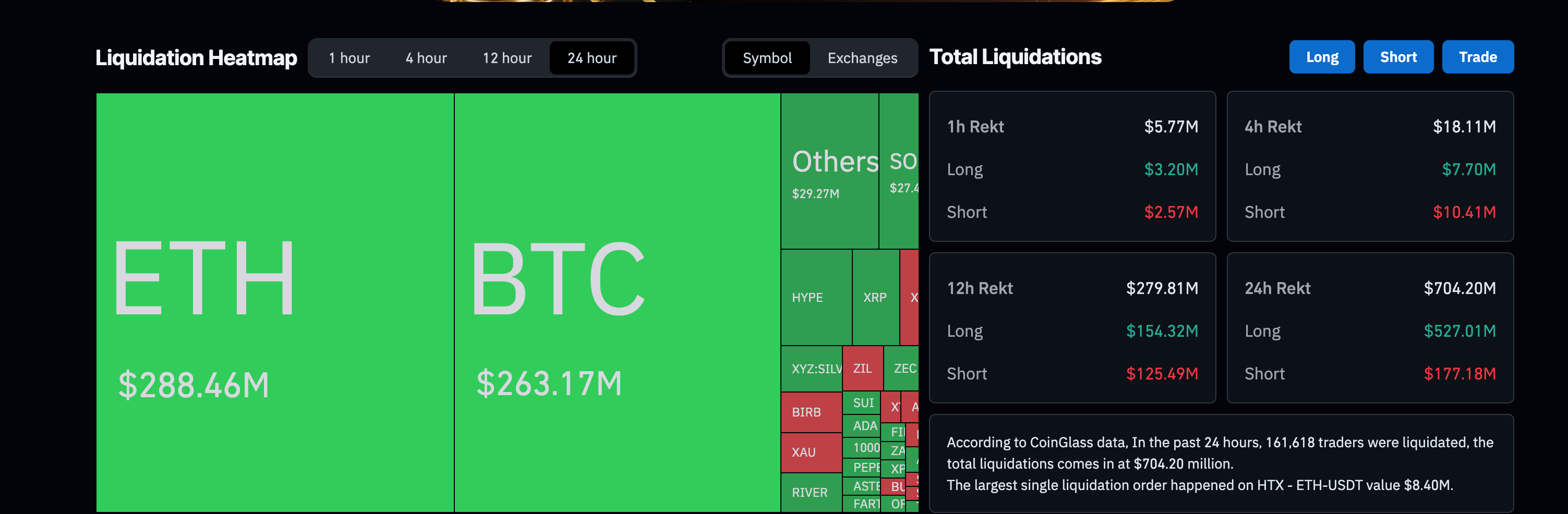 Cette chute initiale a ensuite été amplifiée par une importante cascade de liquidations. Les données sur les produits dérivés montrent que plus de 704 millions de dollars de positions à effet de levier ont été liquidés au cours des dernières 24 heures, les traders à l’achat ayant subi les pertes les plus lourdes. Le Bitcoin et l’Ethereum ont concentré l’essentiel de ces liquidations, les fermetures forcées et les ordres stop-loss ayant accéléré la vente dans un contexte de liquidité réduite.