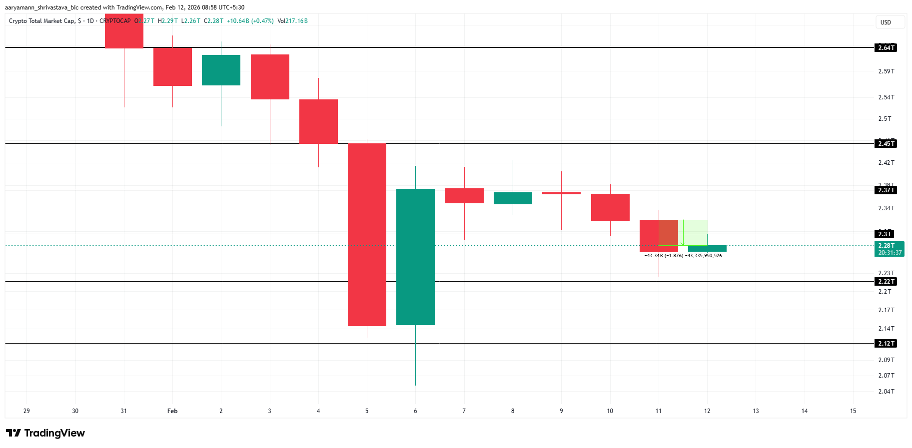 La capitalisation totale du marché des cryptomonnaies a chuté de 43 milliards de dollars en 24 heures, tombant à 2 280 milliards de dollars. La peur persistante a provoqué une cassure sous le support des 2 300 milliards de dollars. TOTAL a également perdu la zone des 2 370 milliards, reflétant un affaiblissement du sentiment du marché crypto et une hausse du risque baissier à court terme.