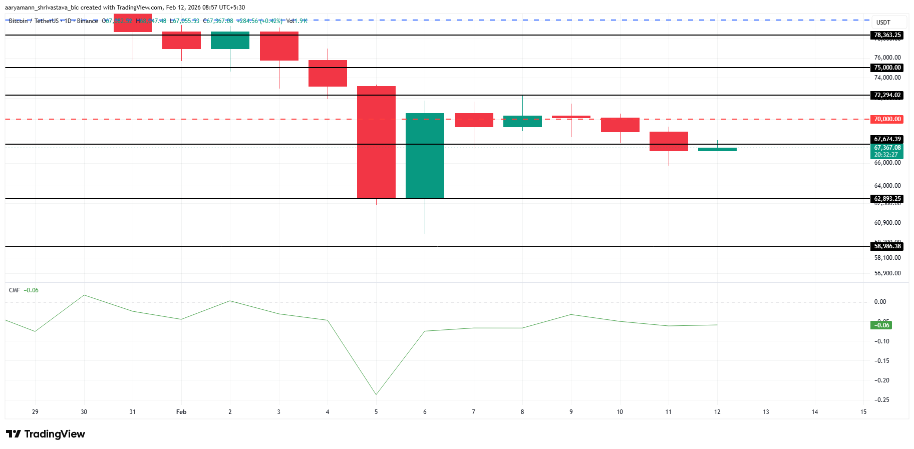 Une chute nette sous les 65 000 dollars renforcerait le biais baissier à court terme. Ce niveau constitue un support psychologique clé pour les acteurs du marché. L’indicateur Chaikin Money Flow reste sous la ligne zéro, ce qui signale des sorties de capitaux persistantes et une pression vendeuse soutenue sur les marchés spot.