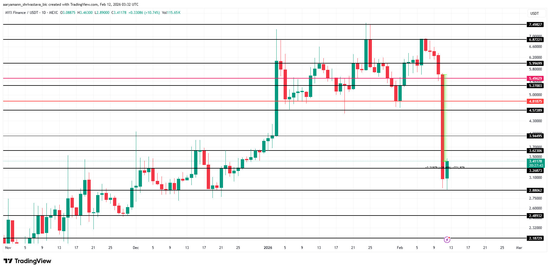 Les prix plus bas ont attiré de nouvelles demandes, entraînant un rebond de 10 % aujourd’hui. Ce mouvement suggère des achats opportunistes à des niveaux réduits. Si les flux entrants se maintiennent, le prix de MYX pourrait reconquérir 3,62 dollars, viser la résistance à 3,94 dollars et potentiellement dépasser le seuil psychologique des 4,00 dollars.